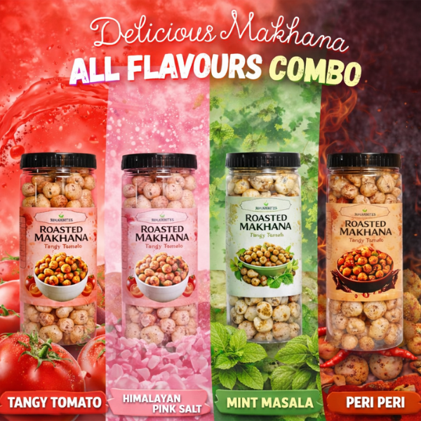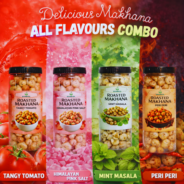 BiharBites Roasted Makhana – All Flavours Combo Pack | Tangy Tomato, Himalayan Pink Salt, Mint Masala & Peri Peri